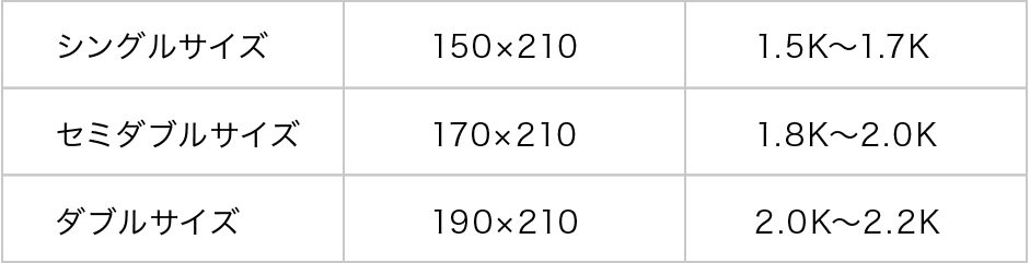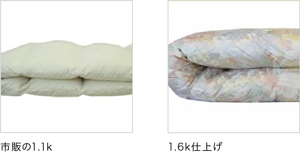 今市販では、シングルサイズで、1.1k〜1.2kしか羽毛が入っていません。当社では末永く使用していただく為に温かさも長続きするように重量にもこだわっております。
